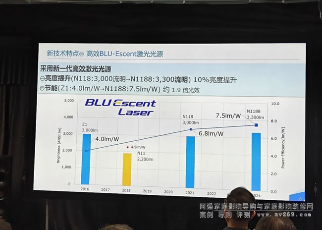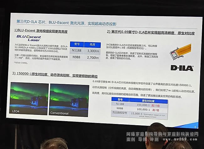 在關鍵的光源部分,采用了JVC更高效BLU-Escent激光光源,DLA-N1188和DLA-N988分別達到3300流明和2700流明的高亮度,使用壽命均為20000小時。與JVC第一代激光投影機相比,新品每瓦功率的有效亮度提高了1.9倍。
