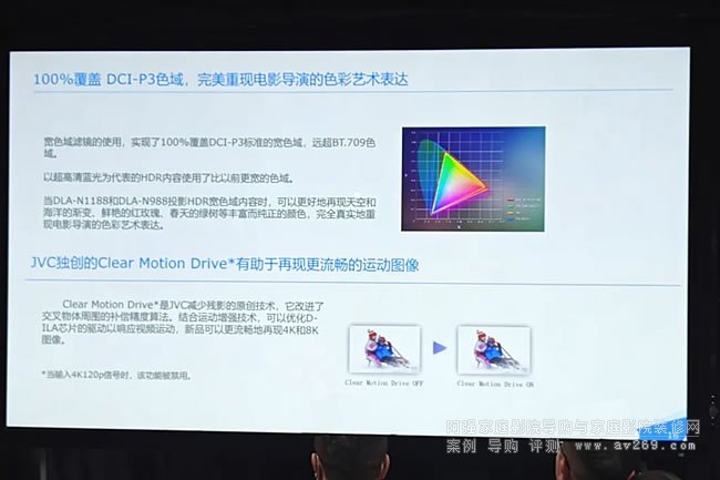 活動之初,JVC投影機產品經理慈騁向在場的行業觀眾、影音愛好者與媒體朋友介紹了JVC建伍品牌的發展情況,所涉及的產品領域,特別是在投影領域方面的發展情況。JVC在投影領域取得了廣泛的應用,具體包括家用投影與專業投影領域,特別在高端家庭影院投影、天文館和飛行模擬器領域有著深厚的耕耘。隨后, 上海麗景信息技術有限公司總經理黃鵬飛對DLA-N1188與DLA-N988的技術特點與優勢進行了詳盡的介紹與分析。