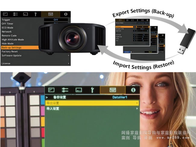 最后一個功能上的變化,則是實用安全性的強化。一般來說,家庭影院投影機在安裝之后都需要經常嚴格的畫面校準,包括灰階白平衡與色彩管理等等,部分投影機還具備自動校正功能。但是如果這些菜單設置并沒有被記下來,萬一被家里的頑童或者到訪的朋友不小心恢復原廠設置,需要重新校準畫面,恐怕是相當頭痛的事情。這次升級了3.0固件之后,菜單上就增加了USB備份的功能的,可以將投影機的菜單設置一次性打包存儲在外置的U盤上,基本上就沒有了后顧之憂。