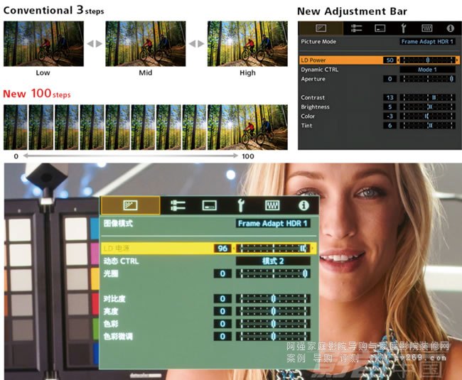 升級3.0固件之后,另一個重要的功能上的完善則是為DLA-N118、DLA-N98以及DLA-N88這三款旗艦機型提供了更佳細致入微的激光光源亮度精細調整功能,由原來只是3級亮度的調整,全面升級為可對0到100級亮度的逐級調整。這個功能顯然是為了滿足那些挑剔發燒友對于HDR觀影時更佳細致的亮度微調而準備的,可以針對自身的觀看空間光線環境,不同HDR片源所采取的不同制作亮度等級,甚至是投影幕的幕料材質差異進行精準的控制,以在每部HDR電影大片觀看時獲得最佳的觀感。