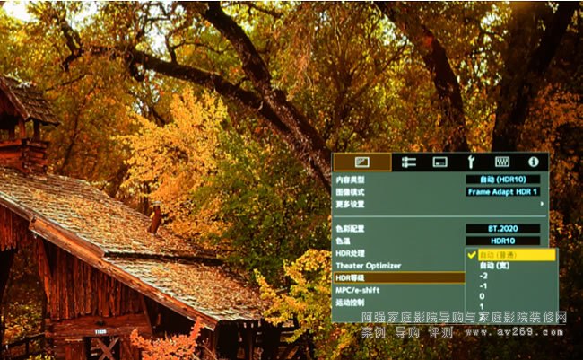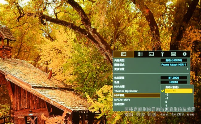 究竟實際的HDR畫面會有多大程度的提升,我們采用了經典的《DVS UltraHD HDR-10 Test Patterns》樹林中的小屋測試片源進行分析,可以看到在使用Frame Adapt HDR幀適應HDR功能之后,HDR等級選擇自動(寬),明顯高光能量得到顯著提升,暗部細節更佳豐富,同時觀察高光細節過渡部分,依然能夠維持充足的色彩細節層次。至于打開“逐幀”處理功能后,在面對大動態光影變化場景切換時,容易產生的亮度呼吸效應問題也得到了不少的改善,比如說觀看經典的《蝙蝠俠:黑暗騎士》以及我們所熟悉的《雙子殺手》,不同亮度場景之間的切換更為流暢順滑。以家庭影院投影機內置芯片處理效果方面而言,毫無疑問屬于第一梯隊的高水平表現。