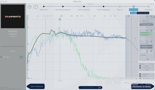 試用DENON AVC-6800H時,我使用Audyssey MultEQ XT32來優化聲音。這次使用Cinema 30,我分別使用了Audyssey MultEQ XT32和Dirac Live,并把所有分析數據都做存檔。最終我選擇使用Dirac Live進行聲音優化。而且因為要舉辦試聽活動的關系,超低音音箱的擺位不能像自己平時一個人在視聽室試聽器材那樣自由,所以我把超低音音箱擺放在前方,也重新調整了前方三只音箱的擺位,把左/右聲道音箱之間的寬度的進一步拉大。