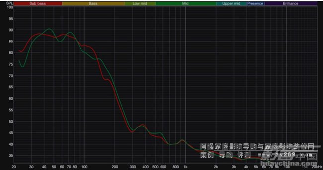 雙低音音箱 + Dirac Live修正前后的LFE聲道頻響曲線對比,綠色頻響曲線為關閉Dirac Live,紅色頻響曲線為打開Dirac Live,不僅更平滑,而且低頻下潛更好。而且我在調整低頻的時候以31.5Hz作為轉折點,往后快速衰減