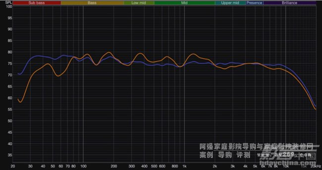 中置聲道音箱 + 低音音箱修正前后對比,黃色曲線為未作任何調整的原始狀態,藍色曲線為Dirac Live修正后的狀態