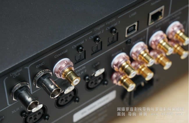 H600的RCA插座部分用上了更高級的制品,另外,同軸數字輸入和輸出也配置了BNC接口,這種接口在專業音頻領域非常常見,如果你的轉盤,或者數字聲卡有BNC接口,可以一試,用耳朵來感受BNC接口和RCA接口在音質上是否有區別