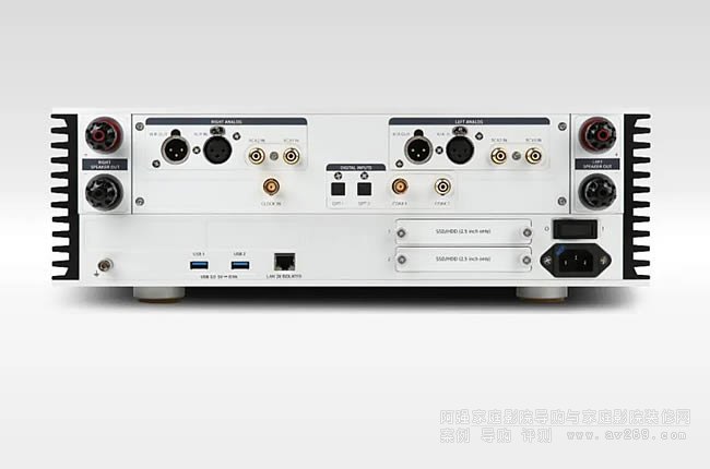 這款AP20的體積比Aurender過去的所有機型都更大,也更有分量,外型同樣非常精致,機箱以潔白的鋁合金搭建而成,兩側還有大面積的散熱片,機箱結構厚實,底部也用上原廠標準的軟木抑振腳座,減少箱體共振產生。面板也是玩家們熟悉的外型,中央有一個8.8吋的超大IPS LCD彩色屏幕,這是Aurender串流機很迷人的地方,除了能顯示大型專輯封面,還能顯示各國曲目,使用體驗滿分!面板的其余部分,原廠也盡可能維持簡約,左側有輸入/輸出和電源按鍵,電源外圍有一圈細致的冷光,反應開機、待機等狀況。右側有一個CNC切削的鋁合金音量旋鈕,另外還有四個實體按鍵,這能讓你在沒有網絡的情況下,播放您存放在AP20硬盤內部的音樂檔案,使用音樂服務器功能。最后它也有一組6.3mm的耳機輸出,夜間想聽音樂時也不怕吵到鄰居。翻到背面會發現AP20的端子支持也很豐富,首先搭載雙層隔離的超低噪聲RJ45端子,兩組光纖、一組同軸輸入,可以外接CD轉盤使用,還有兩組USB端子,也能播放隨身硬盤存放的音樂。模擬的部分,它支持兩組RCA、一組XLR輸入,能跳過本機的DAC功能把AP20當作純綜擴使用,也支持唱放功能,可連接黑膠唱盤聆聽。更特別的是它還有兩組XLR模擬輸出,透過原廠App的模式選單,當你切換到「XLR+Speaker」檔位時,此時XLR能充當Sub輸出,讓您外接主動式超低音建構2.1聲道系統,強化低頻的爆發力。