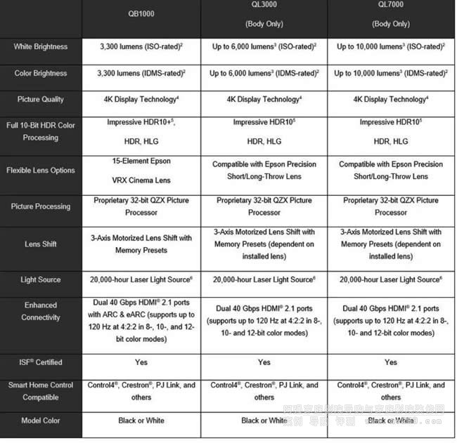 QL3000定價為14,999美元,提供6,000 ISO流明的亮度,而QL7000定價為29,999美元,提供10,000 ISO流明的亮度。這兩款產品標志著愛普生進入了一個新的高端市場領域。這兩款投影機專為需要高亮度輸出的大屏幕或有環境光條件下的高端家庭影院和居住空間而設計。兩款機型都不配備鏡頭,用戶可以從愛普生為大型場所EB系列投影機設計的廣泛鏡頭中選擇。
