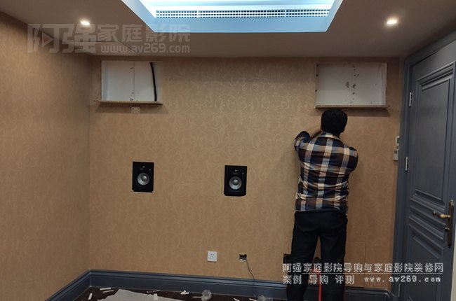 經(jīng)過(guò)細(xì)致的現(xiàn)場(chǎng)勘查和精心規(guī)劃,阿強(qiáng)發(fā)現(xiàn)墻面存在約10厘米的空腔,這為設(shè)備安裝提供了寶貴的空間。決定采用嵌入式安裝方式,將家庭影院的前置音箱巧妙地隱藏于墻面之中,既節(jié)省了空間,又保持了室內(nèi)的整潔美觀。對(duì)于K歌系統(tǒng)的音箱,考慮到空間限制,選擇了卡包音箱,并設(shè)計(jì)了半嵌入式的擺放方案,通過(guò)現(xiàn)場(chǎng)開(kāi)洞并把開(kāi)洞后的板子做成簡(jiǎn)易托板,確保音箱的穩(wěn)固安裝。