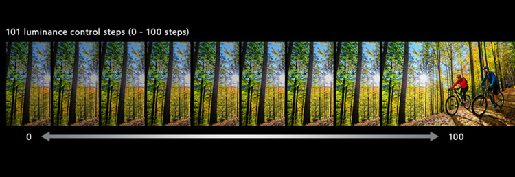 幀自適應(yīng) HDR 中添加了新的深黑色調(diào)控制,并采用新算法進(jìn)一步柔和黑暗區(qū)域中的色調(diào),以實(shí)現(xiàn)更逼真的黑暗。此功能最大限度地提高了新一代 4K D-ILA 設(shè)備的動(dòng)態(tài)范圍,并提供比以往更高的對(duì)比度的圖像。具有明暗陰影的場(chǎng)景(如夜景)可以更真實(shí)地投影。