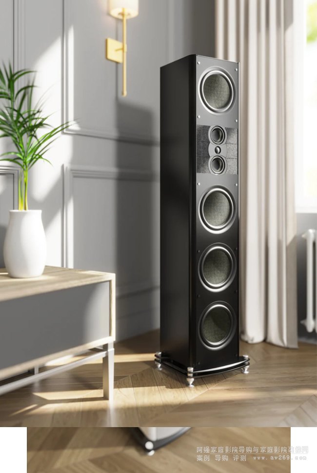 中音和高音揚聲器設置在鋁制安裝板上,將它們與前擋板隔離。這種設計根據箱體的顏色量身定制 - 鋁色為白色,無煙煤色為黑色 - 通過減少不需要的共振來提高音頻清晰度。