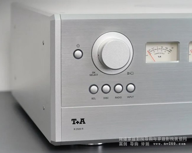 R 2500 R多功能一體機是T+A(聽佳音)廠方近期推出的新產品,外觀延續了R系列的經典設計。前面板左側設有電源開關、輸入選擇、播放控制等一系列功能按鈕和旋鈕,中間設置了一對電平表,右側設有LCD點陣顯示屏,顯示屏下方為CD吸入式光驅,最右側為音量控制、功能菜單等按鍵和旋鈕,并設有USB-A接口以及4.4耳機輸出接口。前面板采用鋁塊車制而成,表面采用拉絲處理,提供黑色和銀色可供選擇。