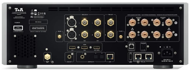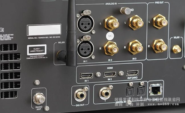 數碼方面設有2組光纖、1組USB-B、2組HDMI,還有網線接口;模擬輸入方面設有2組RCA和1組XLR輸入。輸出方面除了兩組喇叭輸出之外,還有1組RCA前級輸出、1組同軸數碼輸出以及1組帶ARC回傳功能的HDMI接口