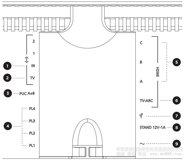 3. PUC A+B:用于連接到 HDMI IN 插座的外部產品的紅外控制信號。您可以使用 Bang &Olufsen 遙控器操作非 Bang & Olufsen 產品。HDMI-CEC 也允許支持的設備這樣做。