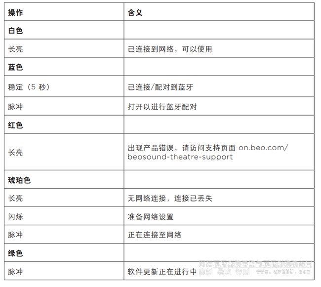 前燈指示器反映“播放/暫停”(Play/Pause) 圖標的行為。當“播放/暫停”(Play/Pause) 圖標顯示白色以外的顏色時,前燈指示器也會顯示相同的顏色。前燈指示燈還用作產品開/關狀態指示燈。Beosound Theatre 打開或關閉時會閃爍一次,播放聲音時會變白。