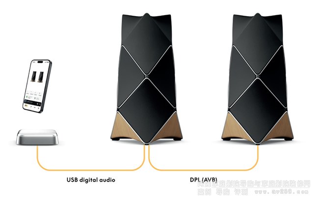 Beolab 50 和 90 揚聲器可連接至 USB-C 端口,創建從信號源到揚聲器的全數字信號鏈。在Beoconnect Core 和主揚聲器之間使用 USB-C to USB-B 2.0 線纜。通過 DPL (RJ45) 插座連接主揚聲器和輔助揚聲器。通過 USB 連接揚聲器后,將所有設備連接到電源并繼續在 Bang& Olufsen 應用中進行設置。將 Beoconnect Core 連接到網絡后,您將在控制屏幕中看到啟用Beolab 50 或 90 的選項。
