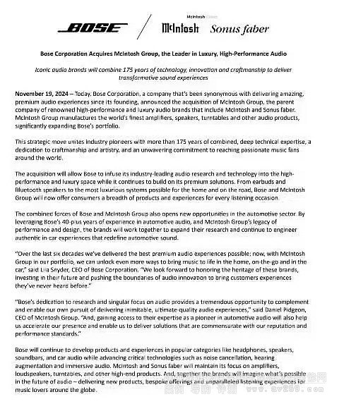 2024年11月19日老牌McIntosh及旗下子公司Sonus Faber品牌由Bose宣布收入囊中,持續(xù)優(yōu)化自有產(chǎn)品在民用高端市場占有一席之地。