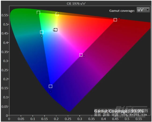 鮮明預(yù)設(shè)模式下的色域覆蓋范圍達(dá)到99.9%,值得留意的一點(diǎn),實(shí)際藍(lán)色和紅色的飽和度要略高于BT.709色域,因此實(shí)際畫面色彩表現(xiàn)要比標(biāo)準(zhǔn)的BT.709色域要來得更為鮮艷
