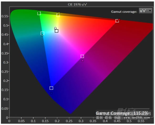 影院預(yù)設(shè)模式的色域覆蓋范圍超過了BT.709,達(dá)到了115.2% BT.709,色彩更為鮮艷,但亮度方面則是略低于鮮明模式