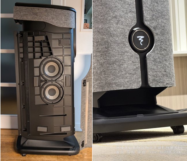 中音單元是一直6.5英寸直徑的“W盆”中音單元,這個單元運用了FOCAL的NIC(中性磁路技術)和TMD懸邊設計。而低音單元同樣是4只6.5英寸直徑“W盆”低音單元。這4只低音單元每兩只安裝在音箱的左右兩側,箱體部分是低音反射式設計,出口位于箱體前面板的下方。FOCAL這么做的目的有兩方面,4只直徑較小的低音單元來代替1只直徑較大的低音單元,加上低音反射式設計,既可以保證低頻量感和延伸,還能縮小箱體的體積,讓箱體的外形更修長,更容易擺放,而且音箱的底座還可以安裝4個輪子,一個人就可以移動音箱。