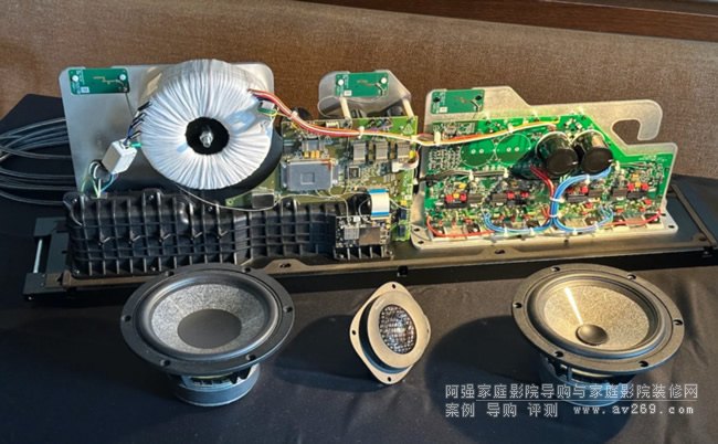 DIVA Utopia是3分頻6單元設計。它的內置功放、電子分頻和數字部分由Naim Audio負責。其中,功放部分是完全的AB類功放。每只音箱里面有4路功放,2路分別負責驅動高音單元和中音單元,這兩路功放的輸出功率均為75W,另外負責驅動低音單元的功放,輸出功率為250W。實際上,驅動低音部分的功放是兩個獨立的功放電路,每個功放的輸出功率是125W,分別驅動左右2組低音單元。