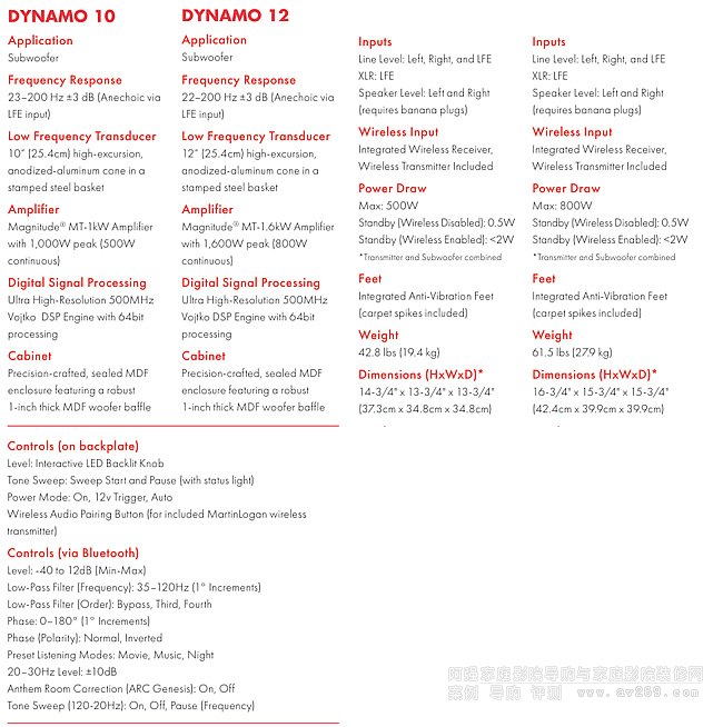 美國馬田蘆根Dynamo12低音炮 作為 Dynamo™ 10 更大、更強大的兄弟產品,Dynamo 12 提供同樣強大的連接性和廣泛的功能列表,但具有更多的輸出能力和低頻擴展,同時保持緊湊的外形。Dynamo 12 令人印象深刻的“簡歷”包括一個定制的 12 英寸鋁制低音揚聲器、一個 1600W 峰值功率放大器和一個具有 64 位處理能力的一流 500MHz DSP 引擎,所有這些都安裝在一個精心制作的 1 英寸厚箱體中。Dynamo 12 具有強大的功能和高精度,還具有從 XLR 到內置無線選項的各種連接選項。Dynamo 12 還具有 MartinLogan 強大而直觀的控制應用程序,可方便地進行設置和調整,并與屢獲殊榮的 Anthem Room Correction (ARC)® 系統兼容。