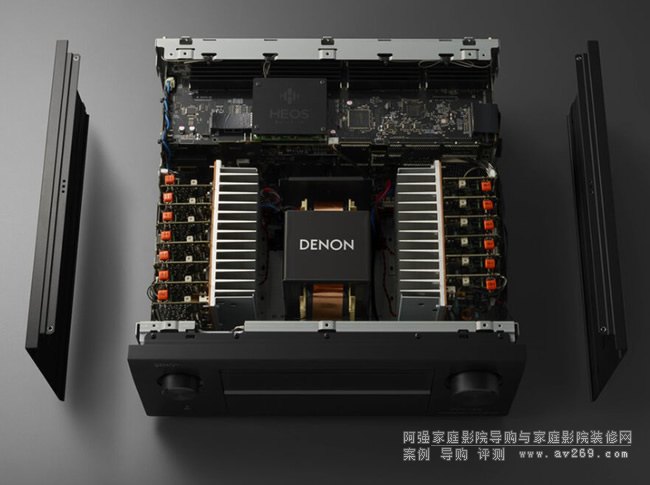 AVR-A10H 的 13 通道單片放大器每通道可提供 150 W 的功率。與高端放大器設計的典型做法一樣,每個通道都建立在自己的 PCB 上,以最大限度地減少串擾和失真。
