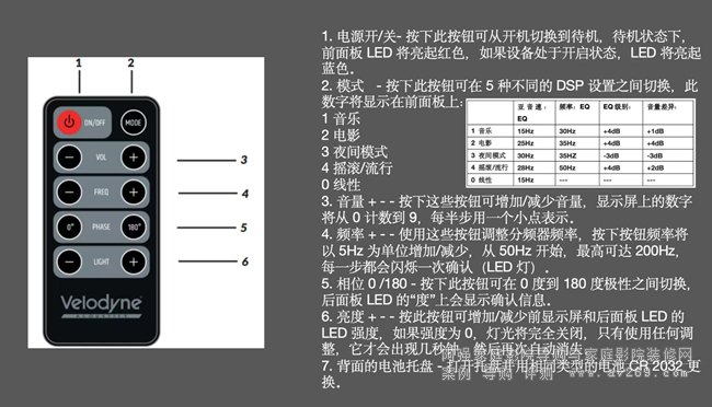 主動式低音炮,265毫米(12英寸)紙盆,下射反射孔,RCA輸入,揚聲器級輸入,LFE輸入,遙控器,RCA輸出,300瓦連續輸出功率,600瓦脈沖輸出功率,D類功放,無級低通交叉設置,無級音量控制,可切換相位,LFE輸出,自動開關機,可調亮度及切換顯示。阿強家庭影院