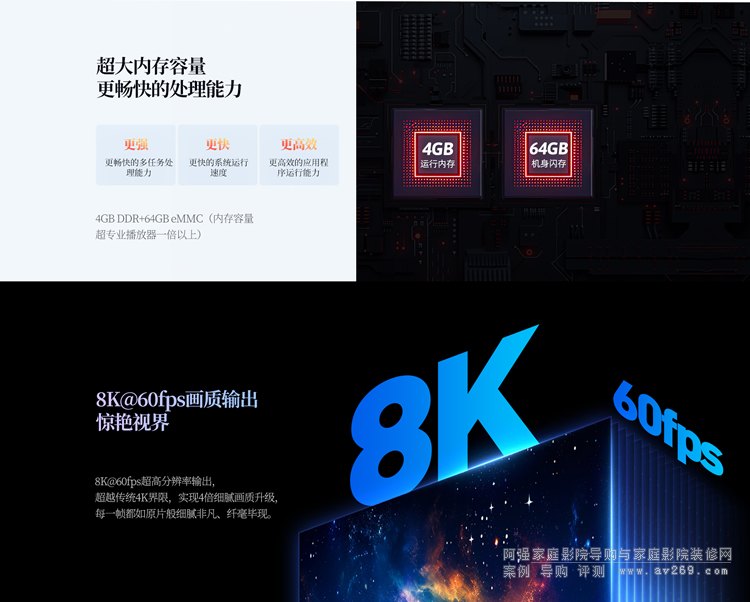 芯片 rk3588s 八核64位架構(gòu),四個(gè)Cortex-A76核心和四個(gè)Cortex-A55核心 ;;存儲(chǔ) 4G+64G;8K解碼 H.265 HEVC/MVC Main10 L6.1 : 8K@60fps (7680x4320) VP9 Profile0/2 L6.1 : 8K@60fps (7680x4320) AVS2 Profile0/2 L10.2.6 : 8K@60fps (7680x4320) H.264 AVC/MVC Main10 L6.0 : 8K@30fps (7680x4320);輸出分辨 率 HDMI 輸出: 7680x4320p 60hz/50hz/30hz 3840 x 2160p 120hz 3840 x 2160p 60hz/50hz/30hz 1920 x 1080p 60hz/50hz/30hz Type-C(DP) 輸出: 3840 x 2160p 30hz 1920 x 1080p 60hz/50hz/30hz;視頻解碼 格式 Real-time video decoder: MPEG-1, MPEG-2, MPEG-4, H.263, H.264, H.265, VP9, VP8, MVC, AV1 H.264 AVC/MVC Main10 L6.0 : 8K@30fps (7680x4320) VP9 Profile0/2 L6.1 : 8K@60fps (7680x4320) H.265 HEVC/MVC Main10 L6.1 : 8K@60fps (7680x4320) AVS2 Profile0/2 L10.2.6 : 8K@60fps (7680x4320) AV1 Main Profile 8/10bit L5.3 : 4K@60fps (3840x2160) MPEG-2 up to MP : 1080p@60fps (1920x1088) MPEG-1 up to MP : 1080p@60fps (1920x1088) VC-1 up to AP level 3 : 1080p@60fps (1920x1088) VP8 version2 : 1080p@60fps;HDR視像 技術(shù) HDR10/HDR HLG/HDR10+/HDRvivid HDR2SDR/SDR2HDR;支持Dolby Vision視頻播放;支持HDR轉(zhuǎn) SDR;支持LPCM音頻 解碼;支持AAC音頻 解碼;; 音頻解碼 格式 音頻解碼格式:支持Dolby AC3 支持Dobly Digital Plus; MPEG L1/L2 AAC-LC、 HE AAC V1/V2解碼 APE/FLAC/Ogg/AMR-NB/WB解碼 G.711(u/a)音頻解碼 音頻文件格式: mp3, wma, aac, ape, flac, mka,aac; 杜比音頻 源碼透?jìng)?支持所有Dolby音軌源碼輸出: Dolby Atmos Dolby TrueHD Dolby Digital Plus Dolby AC3;DTS音頻源 碼透?jìng)?支持所有DTS音軌源碼輸出: DTS-X DTS-HD DTS;LPCM音頻 源碼透?jìng)鳎篖PCM 7.1 LPCM 5.1;無(wú)損音質(zhì) /Hi Fi音質(zhì):支持原生DSD,支持APE/FLAC/WAV ,支持CUE分軌播放;藍(lán)光原盤 解碼:直接解碼;;內(nèi)容/牌照:芒果TV;海報(bào)墻支持 : 內(nèi)置高清影院3.0;在線字幕 功能支持;音樂(lè)播放器支持;;接口:前面板接口: LED數(shù)碼管 紅外接收頭 電源開(kāi)關(guān)按鍵 后面板接口: 高清輸出: HDMI 2.1a x 1 光纖輸出 :SPDIF x 1 以太網(wǎng)網(wǎng)口: 10M/100M/1000M RJ45 x 1 天線結(jié)構(gòu) :外置天線 x 3 Restore按鍵: Restore 按鍵 x 1 電源DC 接口 :電源輸入12V 3A 左側(cè)側(cè)面板接口: Type-C接口 :Type-C x 1 ,支持DP協(xié)議 ,可以輸出畫面 ,可以支持轉(zhuǎn)接U 盤 USB接口: USB 2.0 x 1 USB 3.0 x 1 右側(cè)側(cè)面接口: SATA接口 :SATA接口 x 1 ,支持外接硬盤;硬盤倉(cāng) 無(wú) 遙控器 藍(lán)牙+紅外遙控器 CEC 支持 Wi Fi模塊 支持wifi 6 ,支持2.4G/5G 協(xié)議:802.11 a/b/g/n/ac/ax 3條外置天線 藍(lán)牙模塊 藍(lán)牙5.2 網(wǎng)口帶寬 千兆網(wǎng)口;Cloud Driv e2網(wǎng)盤掛 載服務(wù)支持;SMB共享支持; NFS支持;操作系統(tǒng) Android 12;投屏 :樂(lè)播投屏+ DLNA;電源適配器: 12V3A;產(chǎn)品尺寸 169.5*115*25mm