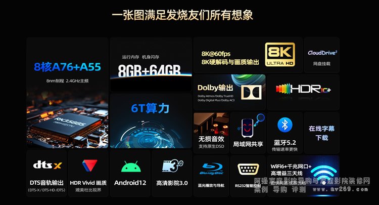 芯片 CPU:Rockchip rk3588s,八核64位架構,包括四個Cortex-A76核心和四個Cortex-A55核心,主頻高達2.4GHz;內存 :8 GB LPDDR4;存儲空間:64GB EMMC;support 2.4G/5G (支持wifi 6) WiFi Standard:802.11 a/b/g/n/ac/ax Bluetooth Version:BT5.2;接口:硬盤倉x 1,HDMI 2.1a x 1 USB 2.0 x 1 USB 3.0 x 1 Type-C x 1,支持DP協議,可以輸出畫面,可以支持轉接U盤 SPDIF x 1;;以太網網口:10M/100M/1000M RJ45 x 1;左右聲道 RCA x 1 同軸 Coaxial x 1 RS232串口 RS232 x 1 IR IN IR IN x 1;外置天線 x 3 Restore 按鍵 x 1 電源輸入12V 3A 船型開關 x 1;Android版本:Android 12;;視頻解碼能力 Real-time video decoder of MPEG-1, MPEG-2, MPEG-4, H.263, H.264, H.265, VP9, VP8, MVC, AV1, mkv.m2ts,iso ;"音頻解碼格式: MPEG L1/L2 AAC-LC、HE AAC V1/V2解碼 APE/FLAC/Ogg/AMR-NB/WB解碼 G.711(u/a)音頻解碼;音頻文件格式: mp3, wma, aac, ape, flac, mka,aac";Dolby音軌解碼 :Dolby AC3支持;Dolby Digital Plus 5.1(EAC3/DD+) 支持 ;;Dolby音軌源碼輸出:Dolby AC3支持 ;Dolby Digital Plus 5.1(EAC3/DD+)支持;;DTS音軌源碼輸出:DTS支持 ;DTS-HD支持;DTS-HD MA支持;DTS HD HRA支持;DTS-X 支持;LPCM音頻源碼透傳:LPCM 7.1支持;LPCM 5.1支持;支持HDR ; HDR10; HDR HLG;3D播放支持;;最高分辨率:7680x4320p 60hz ;支持:藍牙配對 \設置向導 \首頁 \播放記錄 \搜索\ 應用管理 \高清影院 \媒體中心 \視頻播放器 \音樂播放器 \圖片瀏覽器\ 文件管理器 \高清海報墻 \藍光簡易導航 \藍光原盤導航\ 在線字幕\特效字幕(字幕只能普通顯示,暫無動態特效; 內嵌字幕:ass、pgs、psb、txt、idx、DVBSUBTITLE 外掛字幕:ass、srt、ssa、smi、sub、 特效字幕無特效:ass、ssa);DSD音樂:支持原生DSD ;無損音樂:支持APE/FLAC/WAV 支持CUE分軌播放;