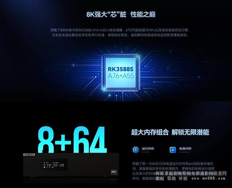 海美迪HD950B 8K播放機搭載了瑞芯微RK3588S A76+A55八核處理器,采用8納米制程技術,輔以6TOPS超強算力NPU和畫質智能優化引擎,無論是高速運算還是多任務并行處理,都能輕松應對。這顆強大的8K芯片,相較于目前市場中其他友商的8K播放機,在處理器核心數、芯片制程以及內存容量等多項指標上均更優秀,為用戶帶來高品質影音播放體驗。