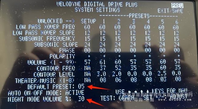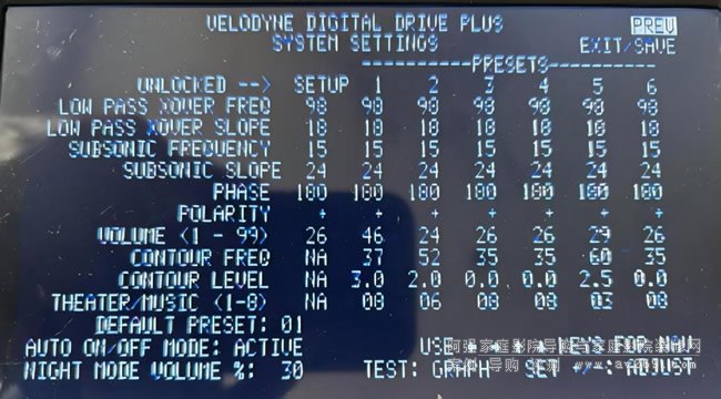 Contour Frequency與Contour Level,具體功用是在不改變整體音量電平的前提下,指定加重或降低某一特定頻段的響應,例如偏重音樂你可以選擇將55HZ左右的頻段加重,偏重狂暴點的可以選擇加重35HZ等,如果你覺得極低頻部分太過了,你可以選擇subsonic freq一項設定對極低頻段如15—25HZ進行斜率衰減,這樣聽感上會更干凈快速,但是下潛就會有影響,如何取舍還得看每個人的聽音習慣了。調整均衡器時要注意看調整的是哪個模式,在左上角會顯示01-06表示,不要調錯了。另相位一旦調好后可以將SETUP列和PHASE(相位)行交匯的那個數字調整為合適的相位數,這樣整行就都修改成功了,最后選擇保存時選YES。