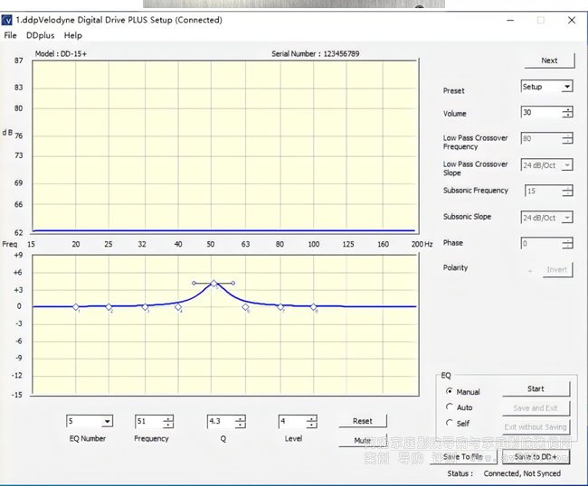 (根據需求手動調整8段EQ及Q值參數)將數據線在DDP關機下插入前面板的左上角USB插口,另一段給到PC端電腦(目前尚不支持MACos系統,只支持windows系統,在網址https://www.velodyneacoustics.com/en/manuals-and-documents/中下載安裝包)安裝成功后會進入以下界面