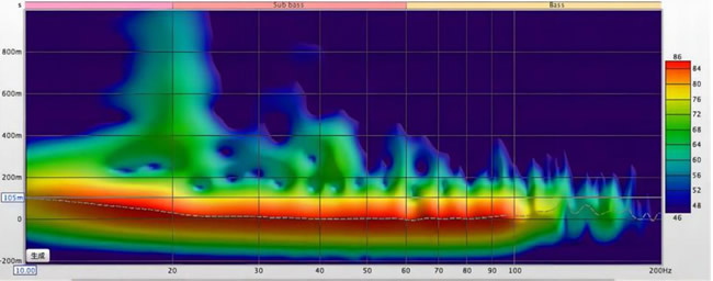 將屏幕進入第二只低音炮系統選擇和第一支低音炮一樣的默認模式同樣將分頻關閉,在參數設置中更改相位配合第一支低音炮,用REW進行測試,直至找到一條相對平直沒有大谷的曲線,最后通過REW的相位對齊工具手動微調延遲參數加載低管導出數據,最后調試前級Dirac或Audyssey以此房間兩臺DDP的曲線及能量圖為例,在20HZ會看到部分的駐波及消散不夠的問題,可通過局部聲學處理進行最后改善。