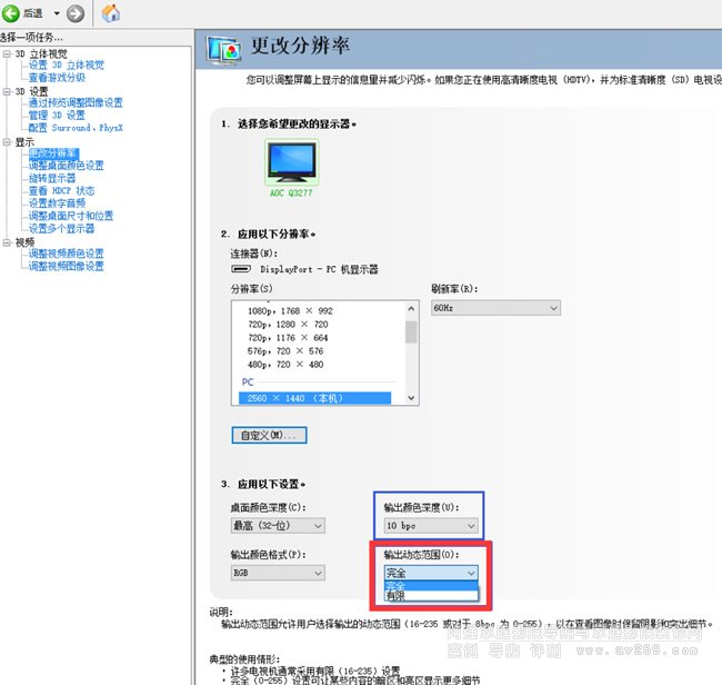 N 卡用戶打開 Nvidia 驅動面板,將紅框中的動態范圍參數調整至完全,藍框的輸出顏色深度調到10bpc或者8bpc(取決于顯示器支持),如下圖