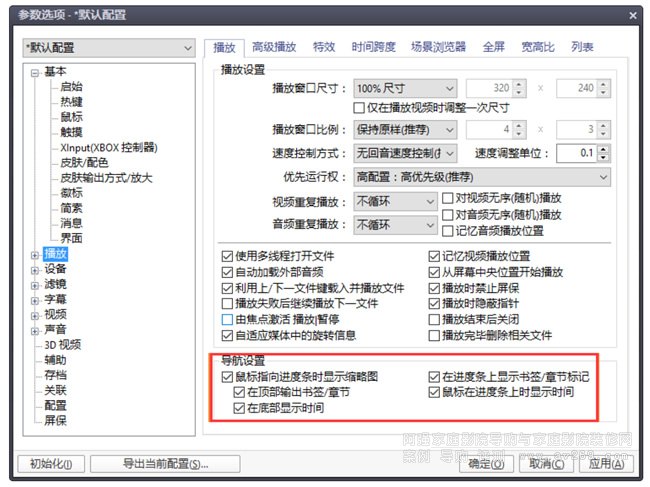 (1)在播放界面點擊鼠標右鍵-選項-播放,打開設置界面,開始調教 Pot 的進度條,將紅框中的部分調整至如下圖,其他選項也可參照圖中改動。