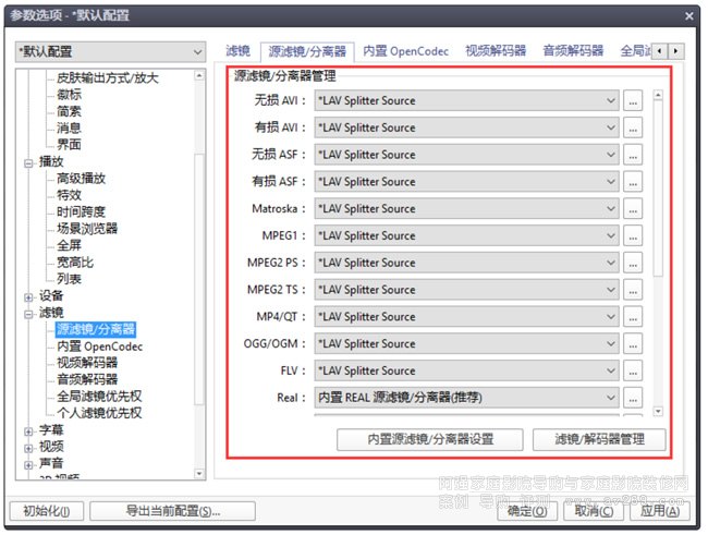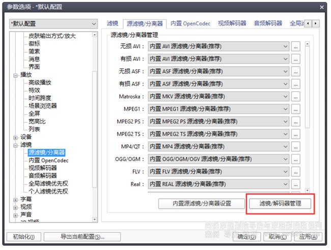 (3)展開濾鏡選項卡,點擊 源濾鏡/分離器 分支,開始載入外掛 LavFilters。點擊紅框中的按鍵,管理濾鏡和解碼器。