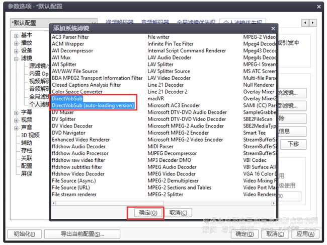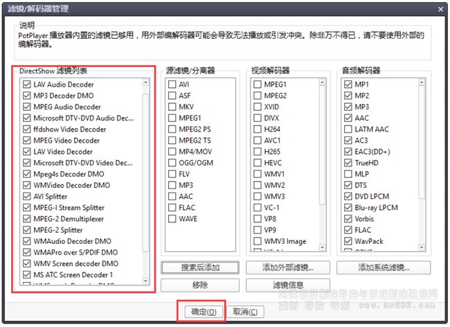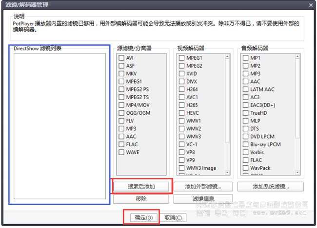 點擊下圖紅框中的搜索后添加,左邊藍框會出現一堆解碼器;點擊確定,加載 LavFilters 完成。