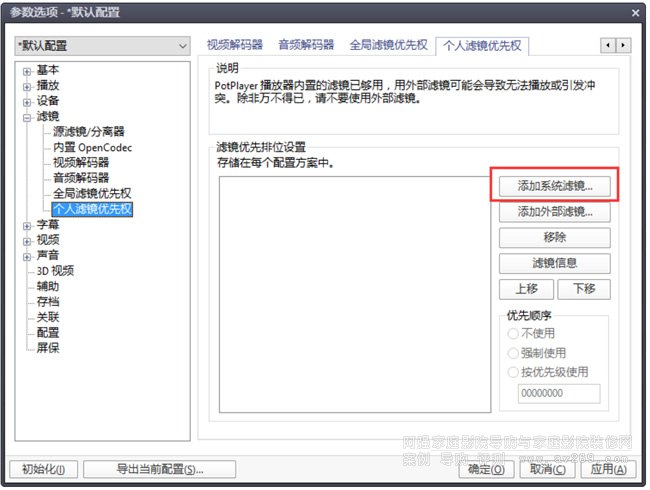 下一步,個人濾鏡優先權,添加字幕插件 xy-vsFilter(即 DirectVobSub,通用) 或 xy-SubFilter(madVR專用)。以前者為例,操作如圖。