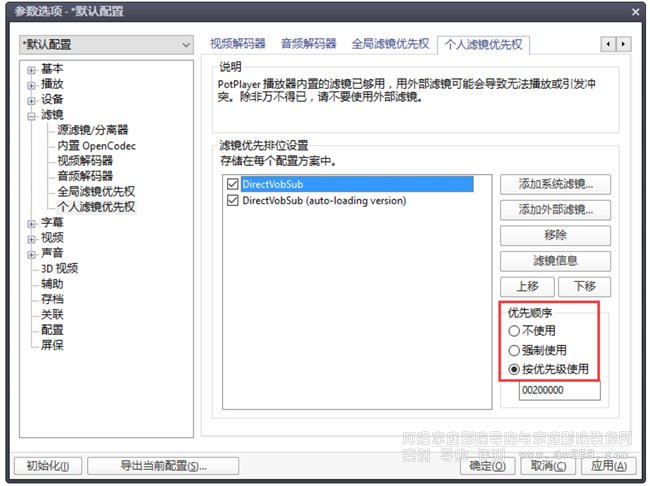 優先級設置上,DirectVobSub (auto-loading version) 設為強制使用,負責外掛字幕;DirectVobSub 設為按優先級使用,負責內掛字幕。