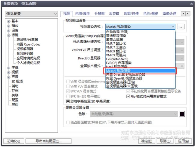 (4)切換至視頻選項卡,設置默認視頻渲染器,選擇 madVR。