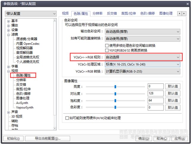 (5)切換至 色系/屬性 選項卡,設置 YCbCr<->RGB 規則,設為自動選擇,如圖。