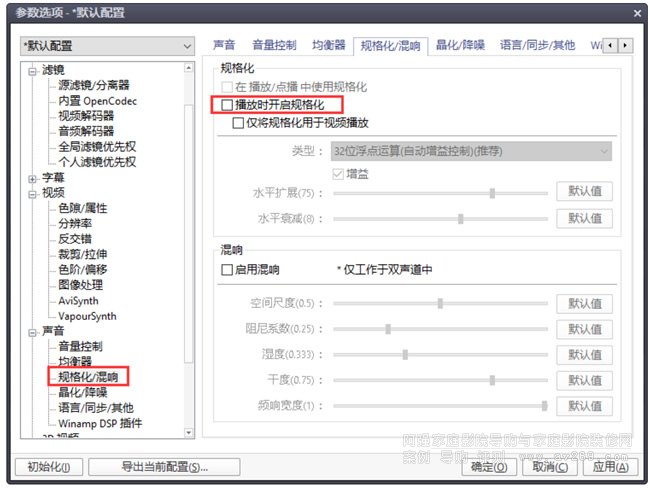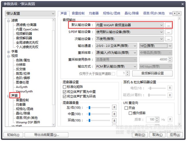 (6)音頻渲染器設置,根據一些文檔敘述,WSAPI渲染器比 Default Direct SoundDevice 效果好,具有程序獨占,抗干擾,延遲低的優點;建議關閉規格化,避免 Pot 擅自改變音量。操作方式如下: