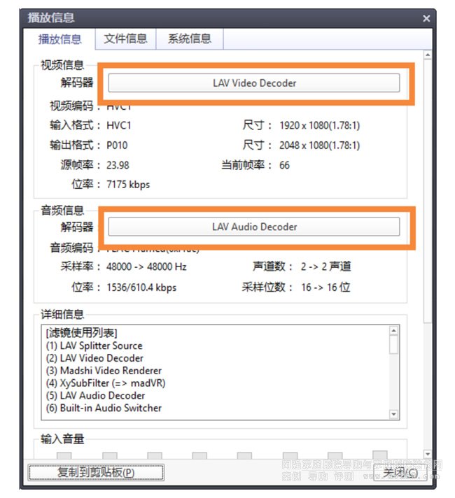 隨便打開一個視頻,在播放界面點擊右鍵-屬性,打開此界面。點擊橙色框就能進入視頻/音頻解碼器設置界面。