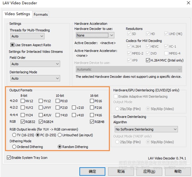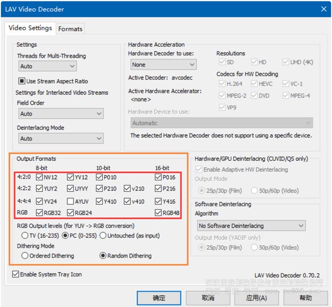 A:如果使用 madVR,橙色框中的 Output Format 勾選除了 AYUV 以外的所有選項;RGB Output Level選 PC;Dither Mode 選 Random。LAV 默認設置就是如此,如圖所示。