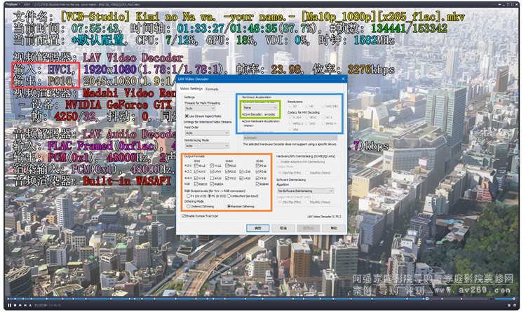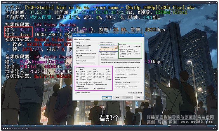 CPU 軟解 + madVR 示范,注意綠框中的 Active Decoder 和紅框中的輸出: