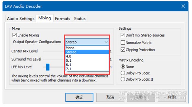 由于絕大部分人都使用雙聲道設備,所以遇到 5.1 聲道音軌時,只有左/右兩聲道會被耳機/音響接收,其他聲道都被直接丟棄了。所以,一般來說我們應讓 LAV 把多聲道混流成雙聲道(Stereo)再輸出;玩多聲道音響的土豪請隨意。