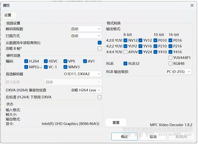 如果你使用 MPCVR 或 madVR,保持默認的 D3D11, DXVA2 即可