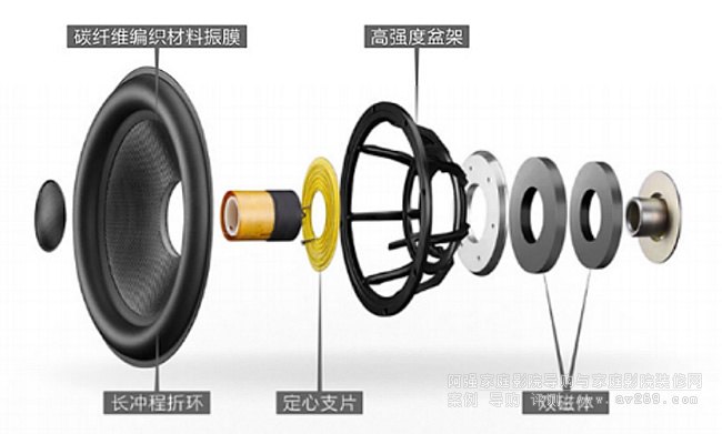 采用擁有出眾解析力的高強(qiáng)度/高阻尼碳纖維編織振膜、低諧振鑄鋁盆架、耐沖擊長(zhǎng)沖程折環(huán)、高穩(wěn)定性CONEX定心支片、大能量雙磁體驅(qū)動(dòng)等配置,保證大聲壓下低音澎湃震撼。