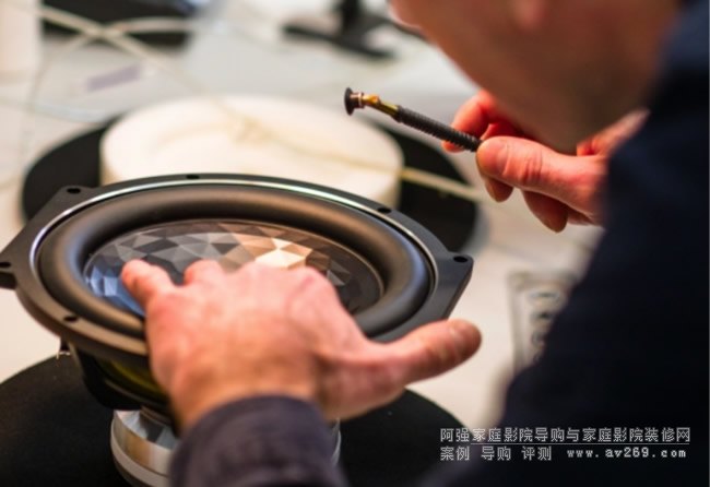 采用推-推/拉-拉式布置的鋁制三明治低音揚聲器的特點是高內部阻尼(紙板錐體)和高扭轉剛度(鋁圓頂),并提供巨大但受控的低音,直至最深的亞音速范圍。橢圓形側板由實木制成,與碳纖維或皮革層壓,在箱體的每一側放置兩個側射式 250 毫米低音揚聲器。