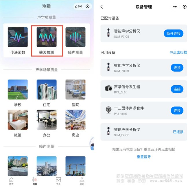 2、在DT Acoustic小程序中選擇駐波檢測功能,藍牙連接智能聲學分析儀SA1;